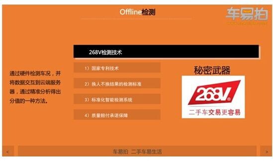当消费者开始进入线下服务体验阶段,车易拍则通过极为专业且快速的268V标准化车况检测体系来完成对消费者出售车辆的客观判断,同时形成给下游车商专业的车况报告,蔡旭表示,其实进入到这个环节,卖车的车主需要做的就是等待30分钟。他认为,自此,车易拍完成的是第一阶段的O2O。
